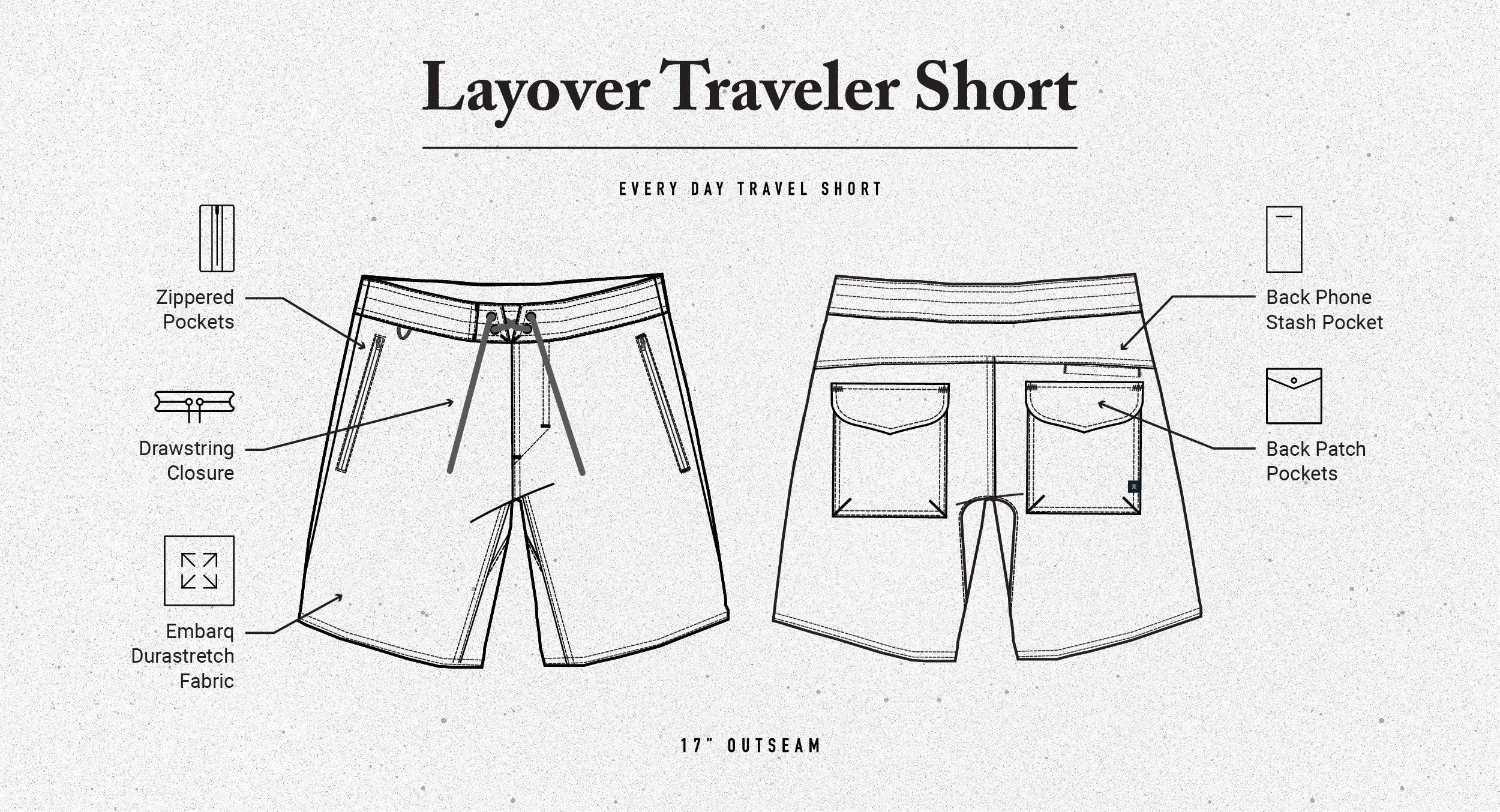 Our new and inspired 17” outseam hybrid adventure short is now constructed of 4-Way stretch, providing a quick drying, durable experience for any adventure. The latest Layover Trail short features a drawstring closure waistband with zipper fly and front zip pocket, a back patch pocket with button closure and small stash pocket at back yoke for quick cell phone storage.