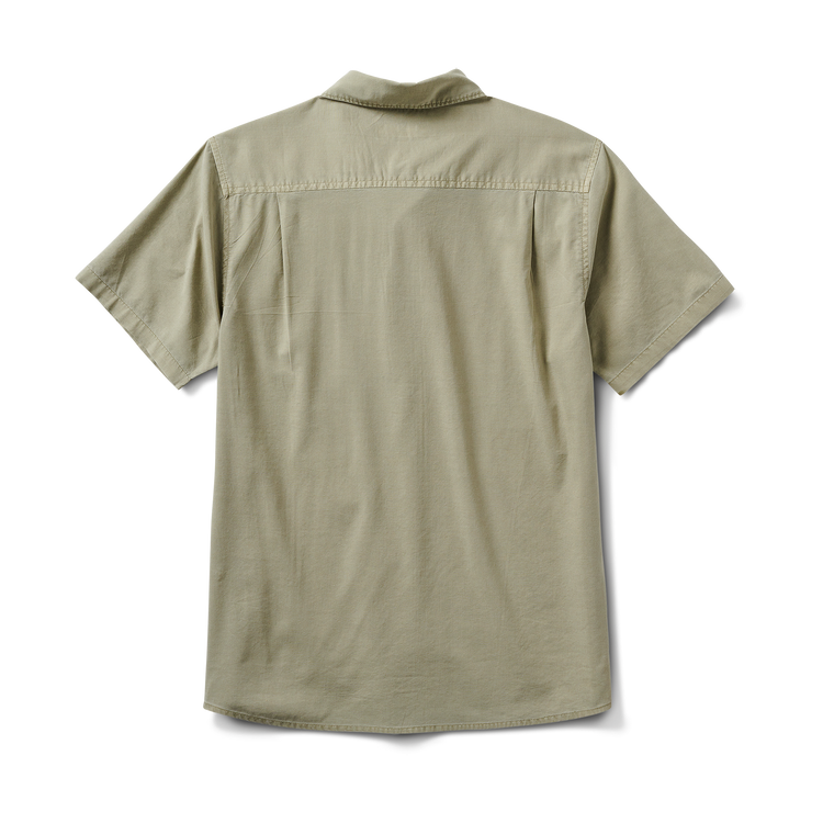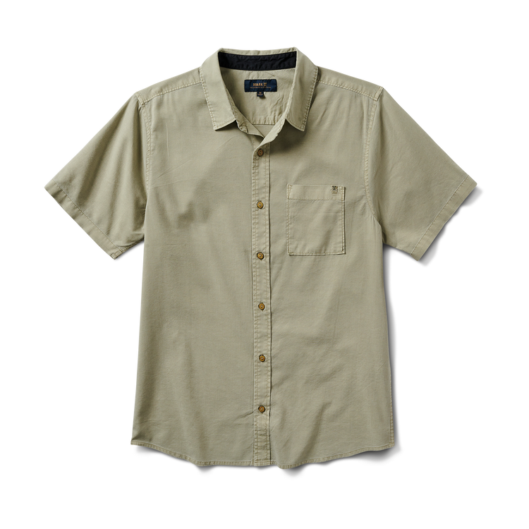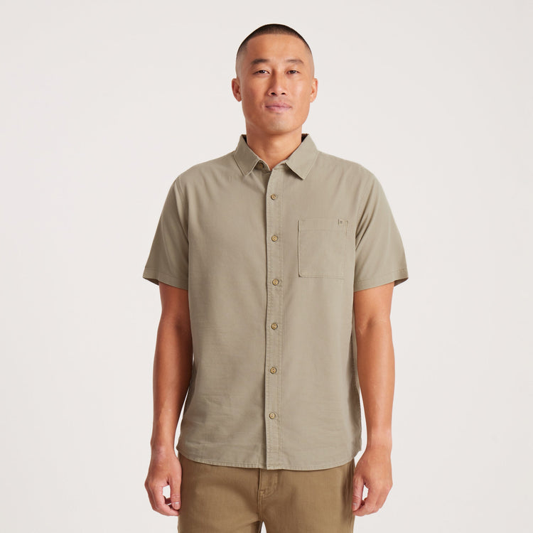 Front view of a men's off-white short-sleeve button-down shirt with a classic collar and chest pocket, a staple for any wardrobe.