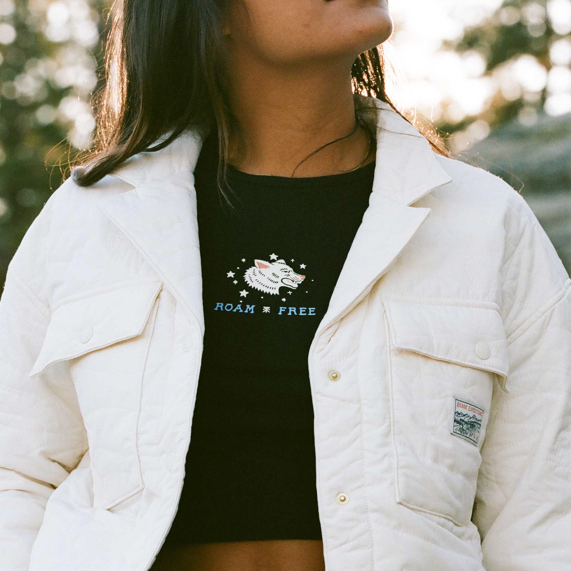 This icon shrunken tight-fit graphic tee is perfect for winter. Featuring capped sleeves and custom puff-print graphic, this effortless tee was meant to be layered alongside your favorite winter jacket and high-waisted denim.